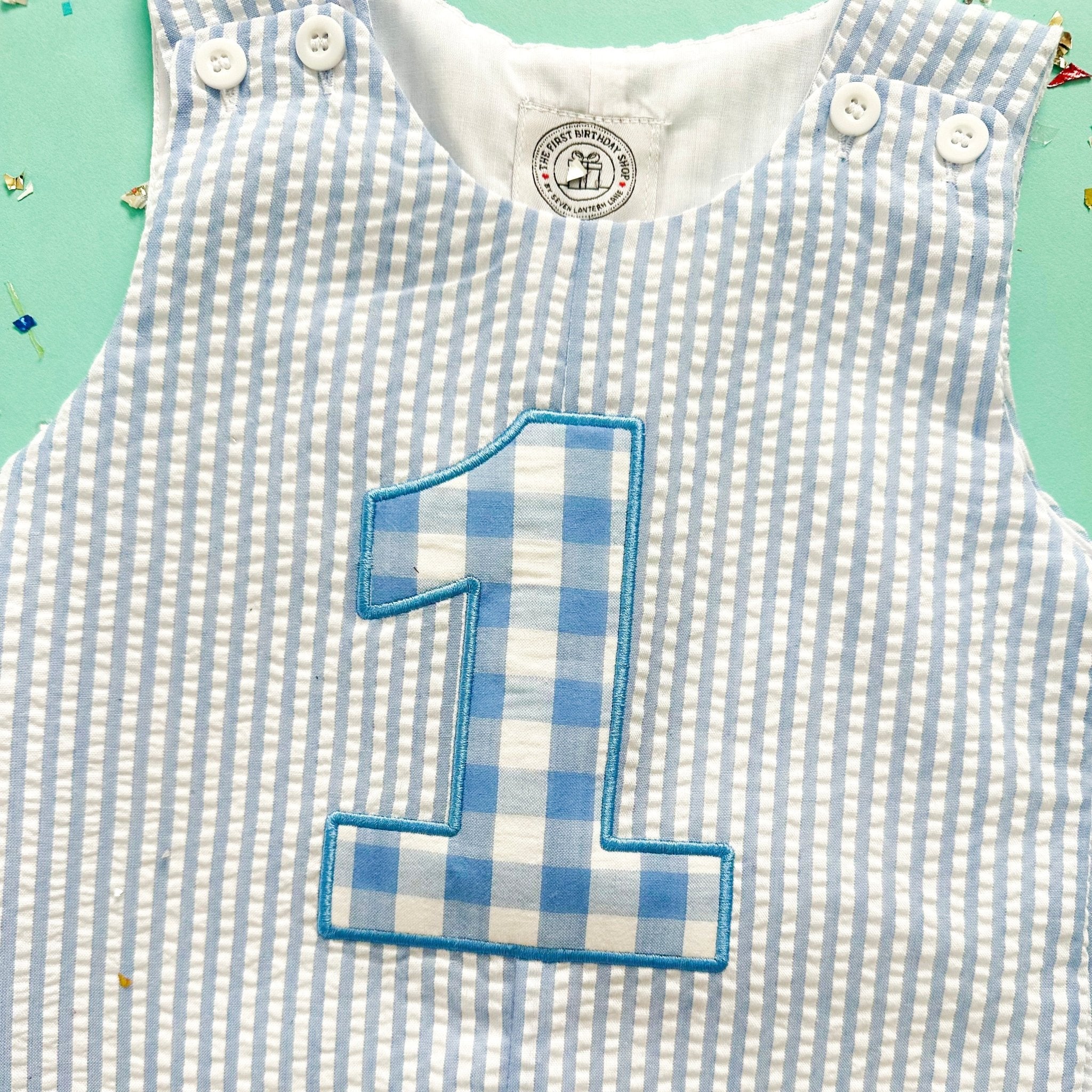 Timeless Southern Style This jon jon is crafted from a crisp blue seersucker fabric that stays cool and comfortable through every celebration. The bold "1" gingham applique on the chest serves as a sweet reminder of how far he’s come in his first year. Whether he’s greeting guests or diving into his smash cake, he’ll look polished, traditional, and perfectly coordinated.
