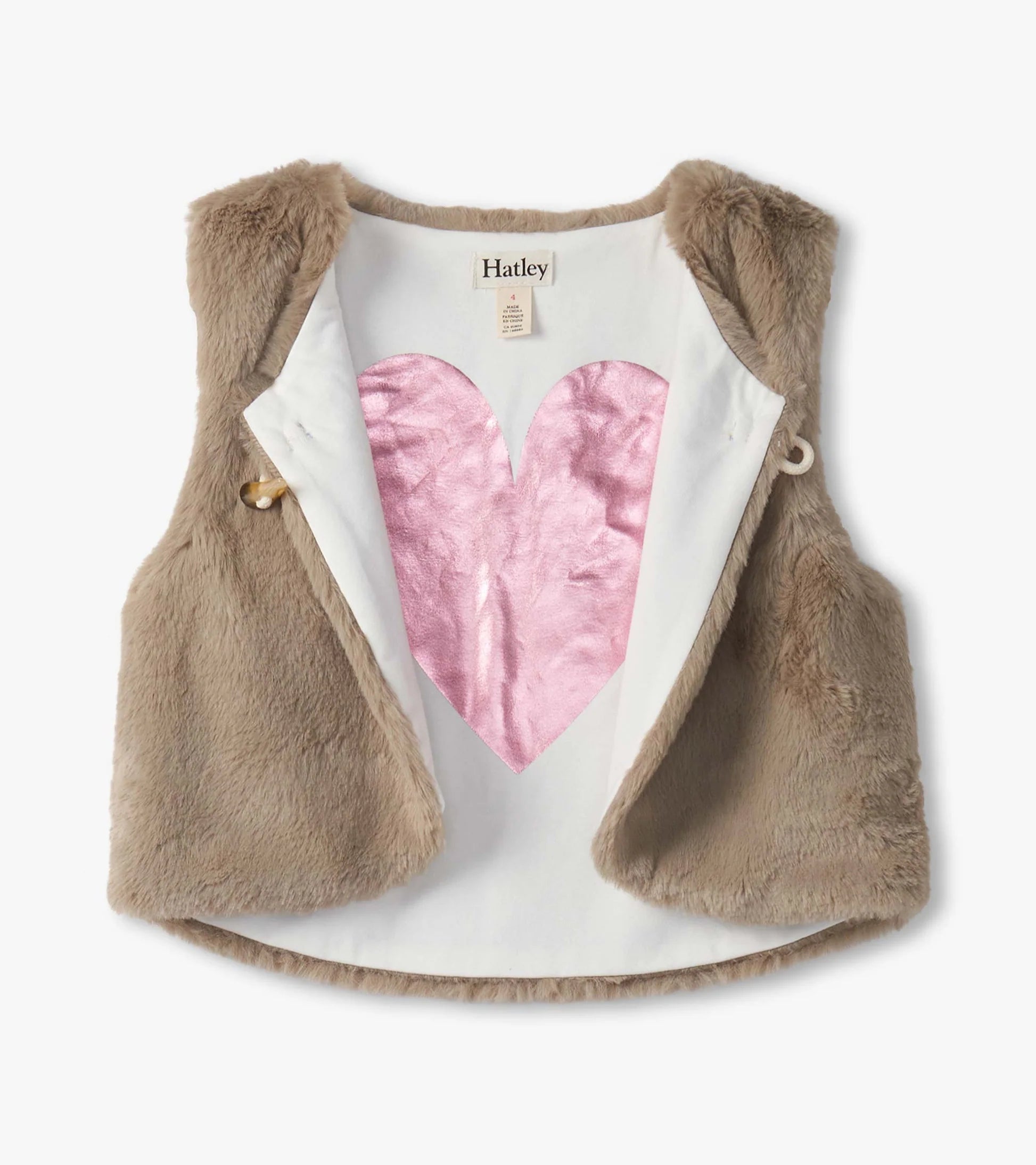 The shell is cozy faux fur, backed by a smooth satin lining. Machine wash cold on a gentle cycle, inside out. Lay flat or hang to dry. Use a cool iron if needed, avoiding direct pressure on the fur.