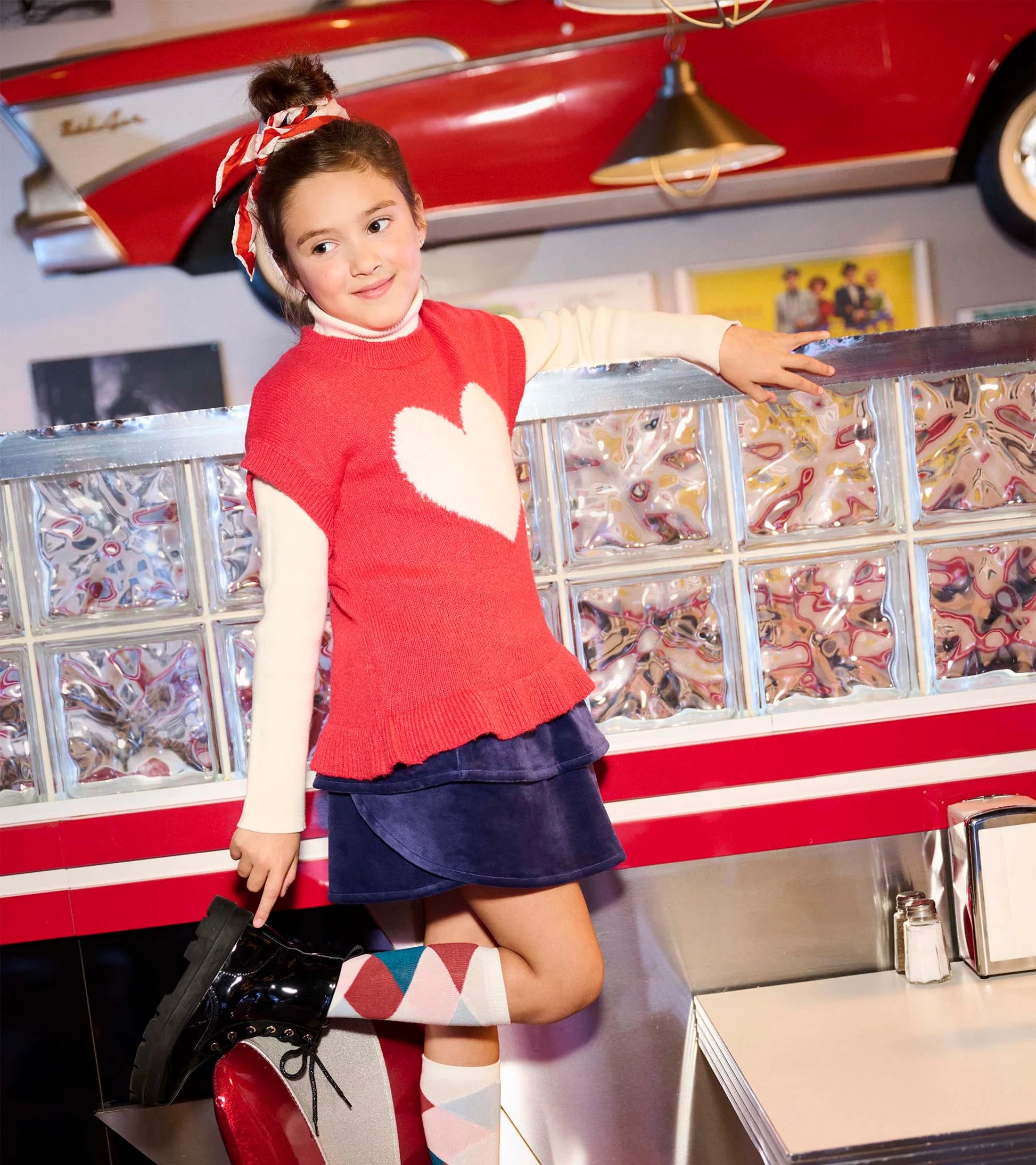 Wrap her up in a little heart-filled joy with this bright red sweater vest designed to shine. The dropped shoulders and cozy crew-neck make it easy to layer over her favorite tee or dress it up for a special outing. Crafted in a soft cotton-acrylic blend for comfy days and playful moments, the flounce hem adds movement while the large white heart detail at the chest reminds her (and you) just how loved she is. It’s more than just a piece of clothing—it’s a little hug she gets to wear.