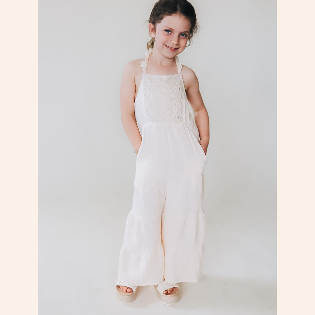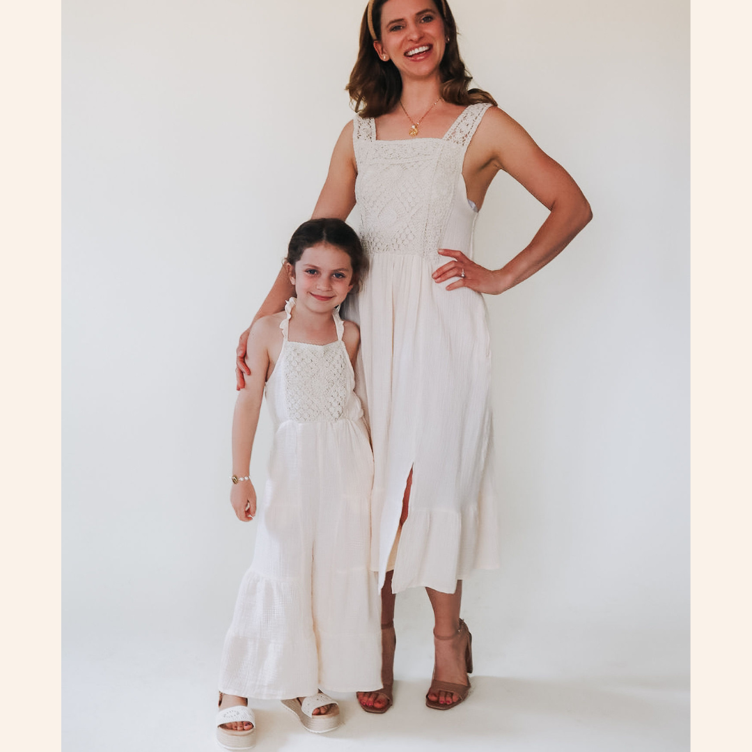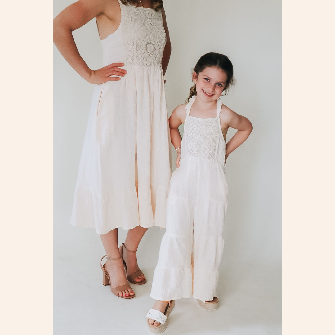 These mommy and me "dresses" are a must-have! Perfect for any event, the lightweight cotton material is so comfy and airy. Mom's dress is a calf length skirt with a stunning crochet bodice, pockets (bonus!), and beautiful crochet straps and a square neckline. The child size is just like mom's in a soft white cotton material with the same beautiful crocheted bodice, and pockets, but instead of a skirt the girl's has flowing flared pant legs for the cutest jumpsuit. These pieces are just too good to resist. You've found the perfect matching outfits for you and your daughter to twin.